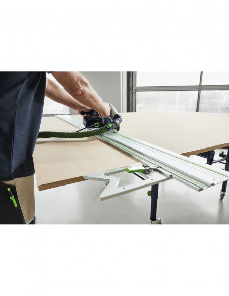 - Do dokładnego cięcia płyt przy użyciu szyny prowadzącej i ręcznej pilarki tarczowej