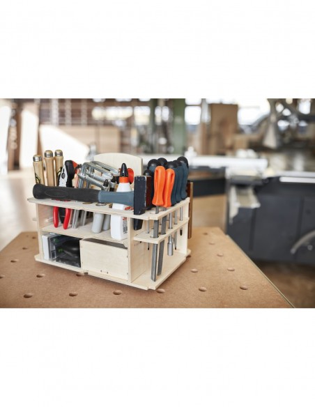 - Szybkie wyszukiwanie potrzebnego narzędzia dzięki przejrzystemu rozmieszczeniu wszystkich narzędzi ręcznych dla cieśli/ stolarzy