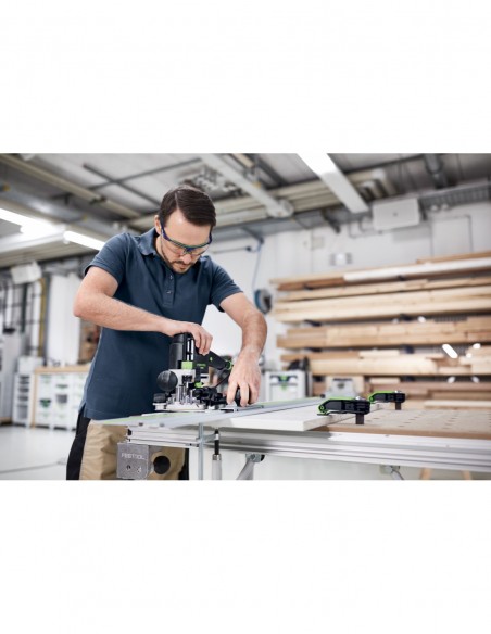 - Trzy typowe odstępy od krawędzi 9,5, 16 i 32 mm można ustawić z powtarzalną dokładnością dzięki zamontowaniu prowadnicy wzdłużnej na szynie prowadzącej z rzędem otworów