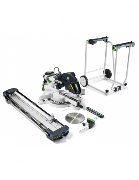 tarcza pilarska WOOD UNIVERSAL HW 260x2,5x30 W60, kątownik nastawny SM-KS, docisk mocujący obrabiany przedmiot, klucz imbusowy SW 6, moduł transportowy, prowadnice do obcinania długich elementów KA-UG-R/L