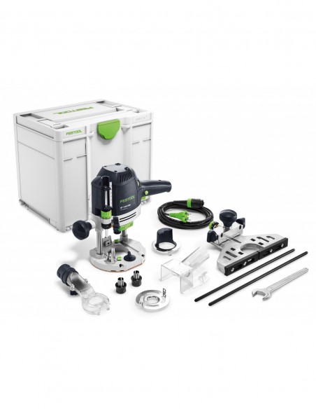 łapacz wiórów, uchwyt zaciskowy Ø 8 mm, uchwyt zaciskowy Ø 12 mm, prowadnica boczna z precyzyjną regulacją, pierścień do kopiowania Ø 30 mm, osłona ssąca na górze, klucz płaski SW 24, przewód sieciowy plug it (4 m), Systainer SYS3 M 337