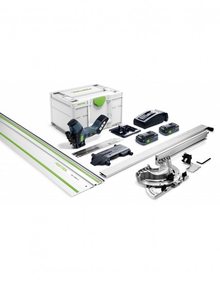 2 x akumulator BP 18 Li 4,0 HPC-ASI, szybka ładowarka TCL 6, zespół tnący ze szlifem falistym SG-240/W-ISC, stół (204160), sanie do szyny prowadzącej, przykładnica kątowa, szyna prowadząca FS 1400/2, Systainer SYS3 M 237
