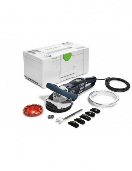 stół prowadzący, zestaw kołnierza mocującego, klucz czołowy KF-AG, pasek z rzepem KV-215 (opakowanie 5 sztuk), tarcza diamentowa DIA ABRASIVE-D130, Systainer SYS3 L 237