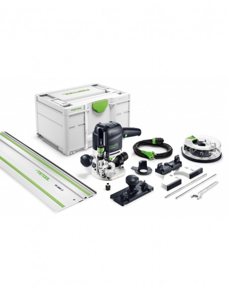 uchwyt zaciskowy Ø 8 mm, prowadnica boczna, adapter do stosowania frezarki z szynami prowadzącymi, łapacz wiórów, skrzynka z frezami, klucz płaski SW 19, przewód sieciowy plug it (4 m), szyna prowadząca FS 800/2, Systainer SYS3 M 237