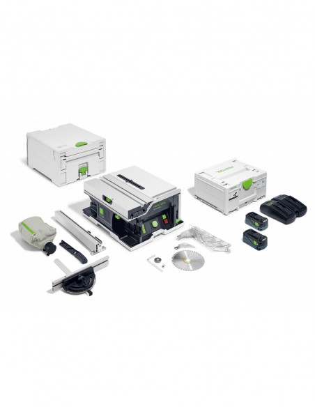 tarcza pilarska WOOD FINE CUT HW 168x1,8x20 WD42, prowadnica równoległa, popychacz, przykładnica kątowa, worek na wióry, klin rozdzielnik do ukrytych cięć, klin rozdzielnik z osłoną, klucz imbusowy SW 6, zestaw zasilający SYS 18V 2x5,0/TCL 6 DUO