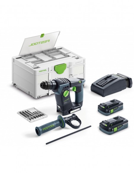 2 x akumulator BP 18 Li 4,0 HPC-ASI, szybka ładowarka TCL 6, dodatkowy uchwyt, ogranicznik głębokości, kaseta z wiertłami BKS SYS3 D5-12 SDS, Systainer SYS3 DF M 187