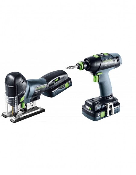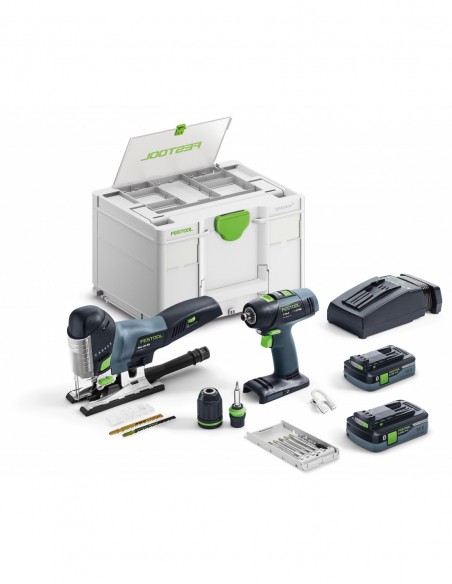 akumulatorowa wiertarko-wkrętarka T18+3, wyrzynarka PSC 420 EB, 2 x akumulator BP 18 Li 4,0 HPC-ASI, szybka ładowarka TCL 6, uchwyt narzędziowy WH-CE CENTROTEC, magnetyczny uchwyt bitów CENTROTEC BH 60 CE-Imp, szybkomocujący uchwyt wiertarski FastFix 13 mm KC 13-1/2-K-FFP, zestaw brzeszczotów do wyrzynarki: 1 x WOOD FINE CUT S 75/2,5 i 1 x WOOD UNIVERSAL S 75/4 FSG, zabezpieczenie przeciwodpryskowe, kaseta z bitami BKS SYS3 D5 PZ TX 100 CE, zaczep na pasek, Systainer SYS3 DF M 237