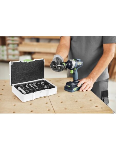 Zestaw 5 wysokiej jakości wierteł Forstnera z wymiennymi końcówkami centrującymi oraz wiertła centrujące 4 mm do różnych zastosowań. Wiertła można zamontować i zablokować bezpośrednio w uchwycie narzędziowym CENTROTEC. Wysokiej jakości wiertła są starannie schowane i bezpiecznie przechowywane w poręcznym Systainerze³ S z przezroczystą pokrywą. A także mobilne: Dzięki stojakowi na Systainery³, Systainery z wyposażeniem można również zintegrować z wyposażeniem samochodowym bott vario3.