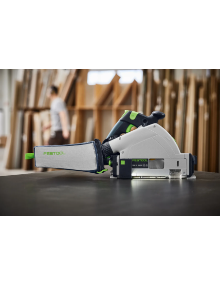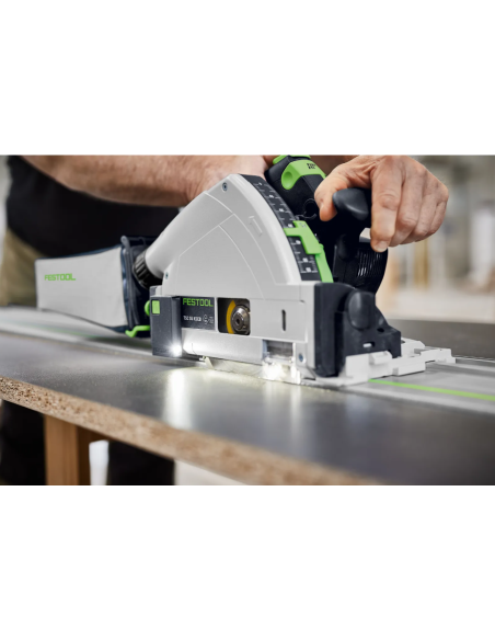 Możliwość szybkiego doposażenia i doskonałego doświetlenia: lampka LED jest zamocowana bezpośrednio na pilarce i zapewnia doświetlenie prawej strony obszaru cięcia bez efektu zacienienia. Dwa poziomy intensywności światła zapewniają optymalną widoczność linii „na rysę” przez około 130 cykli cięcia. Dzięki samoprzylepnej płytce metalowej, która ułatwia montaż na maszynie, w magnetyczną lampkę LED można bez trudu doposażyć wszystkie zagłębiarki TS. Jednostka posiada wskaźnik stanu naładowania, jest demontowalna i można ją naładować za pomocą złącza USB-C.