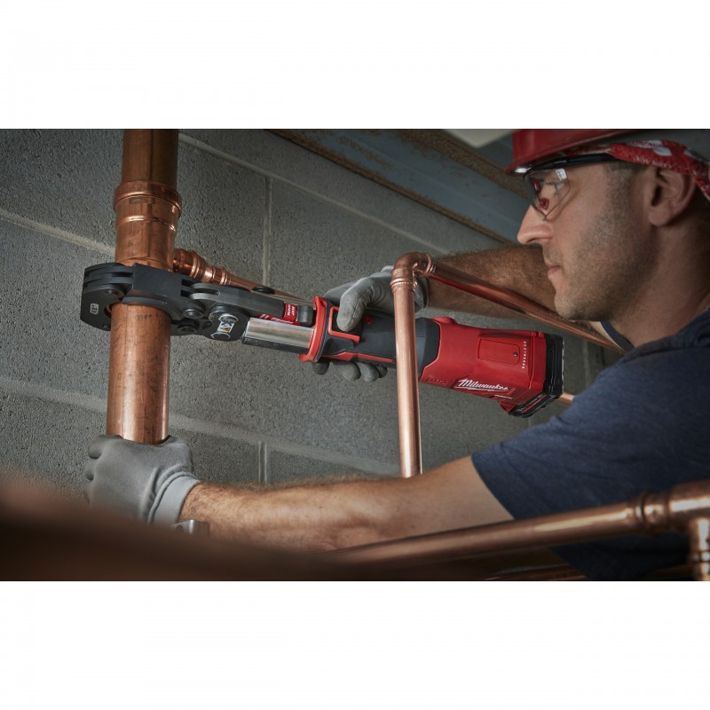 - Narzędzie obsługiwane jedną ręką umożliwia zaciskanie rur umieszczonych ponad głową użytkownika oraz pracę w wąskich przestrzeniach