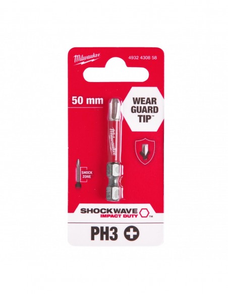 - Geometria Shock Zone zmniejsza naprężenie na końcówce, dzięki czemu jest bardziej odporna na złamanie. Połączenie konstrukcji Shock Zone oraz specjalnej obróbki cieplnej pochłania udar i pozwala aby bit zginał się podobnie jak sprężyna.