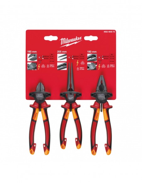 - Zestaw zawiera szczypce uniwersalne 180 mm, szczypce długie okrągłe 205 mm i szczypce do cięcia bocznego 160 mm.