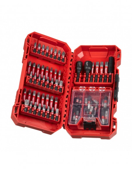 - Bity udarowe SHOCKWAVE™: 52 x 25 mm długości 1 x PH1 / 3 x PH2, 1 x PZ1 / 3 x PZ2, 3 x TX10 / 3x TX15 / 10 x TX20 / 9 x TX25 / 9 x TX30 / 2 x TX40 / 1 x TX50, 1 x TX BO15 / 1 x TX BO20 / 1 x TX BO25 /1 x TX BO30, 2 x Hex 4 mm / 1 x Hex 5 mm. 20 x 50 mm długości 2 x PH2, 2 x PZ2 / 1 x PZ3, 1 x TX10 / 2 x TX15 / 3 x TX20 / 3 x TX25 / 3 x TX30 / 3 x TX40. 2 x udarowa magnetyczna nasadka sześciokątna SHOCKWAVE™ 48 mm długości: Hex 8 mm / Hex 10 mm. 1 x magnetyczny uchwyt bitów SHOCKWAVE™ 60 mm długości