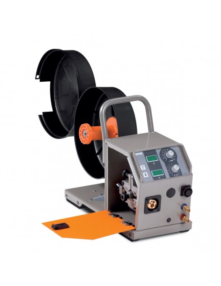 Do zastosowania w konstrukcjach stalowych i na montażu, bardzo wytrzymała metalowa obudowa składa się ze wzmocnionej podłogi i paneli bocznych. Zintegrowane w walizce podajnika elementy sterujące są wyposażone w ochronę przed uderzeniami (obie w stoczni). W pojemnej skrzyni na rolki drutu można bezpiecznie schować 300 m i zapewnić niezawodną pracę przez długi czas. Do zawieszenia walizek można przykręcić ucha dźwigowe, jak zwykle w konstrukcjach stalowych.