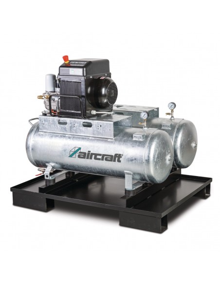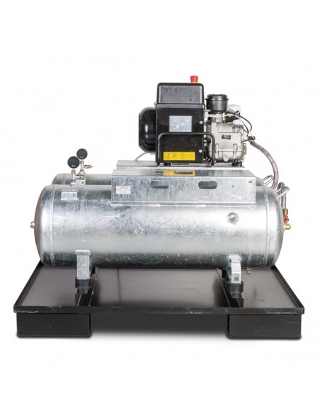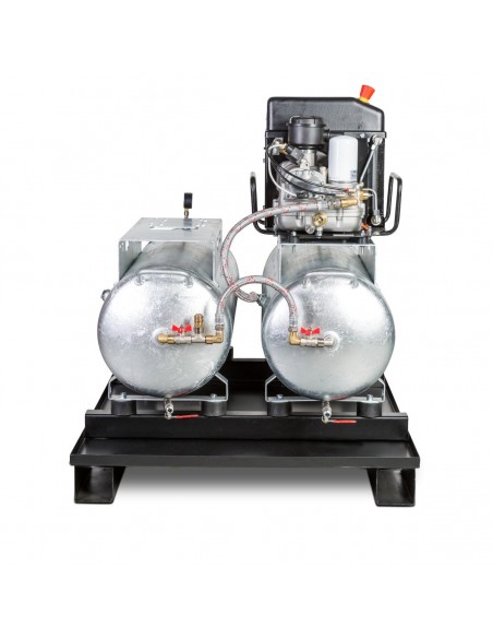 Uniwersalna stacja sprężonego powietrza z dwoma 100-litrowymi zbiornikami sprężonego powietrza na palecie z podstawą zabezpieczającą, zajmująca mało miejsca i możliwa do transportu