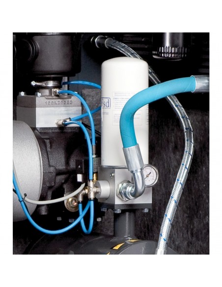 - Sprężarka śrubowa z izolacją akustyczną, napędem pasowym (Poly V o wysokiej odporności na zużycie) i systemem mocowania wózka