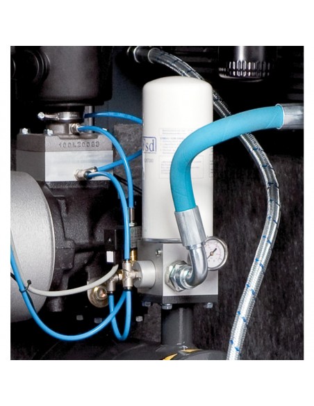 Na podstawie technologii przetwornicy częstotliwości ilość dostarczanego przez sprężarkę powietrza dostosowuje się do rzeczywistego zużycia. Elektroniczny układ sterowania monitoruje prędkość obrotową silnika i sprężarki oraz utrzymuje ciśnienie w sieci na stałym poziomie. Użytkownik otrzymuje zaawansowaną, najnowocześniejszą technologię na najmniejszej przestrzeni.