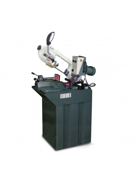 Piła taśmowa do obróbki metalu z wychylnym łukiem piły i bezstopniową regulacją prędkości taśmy piły.