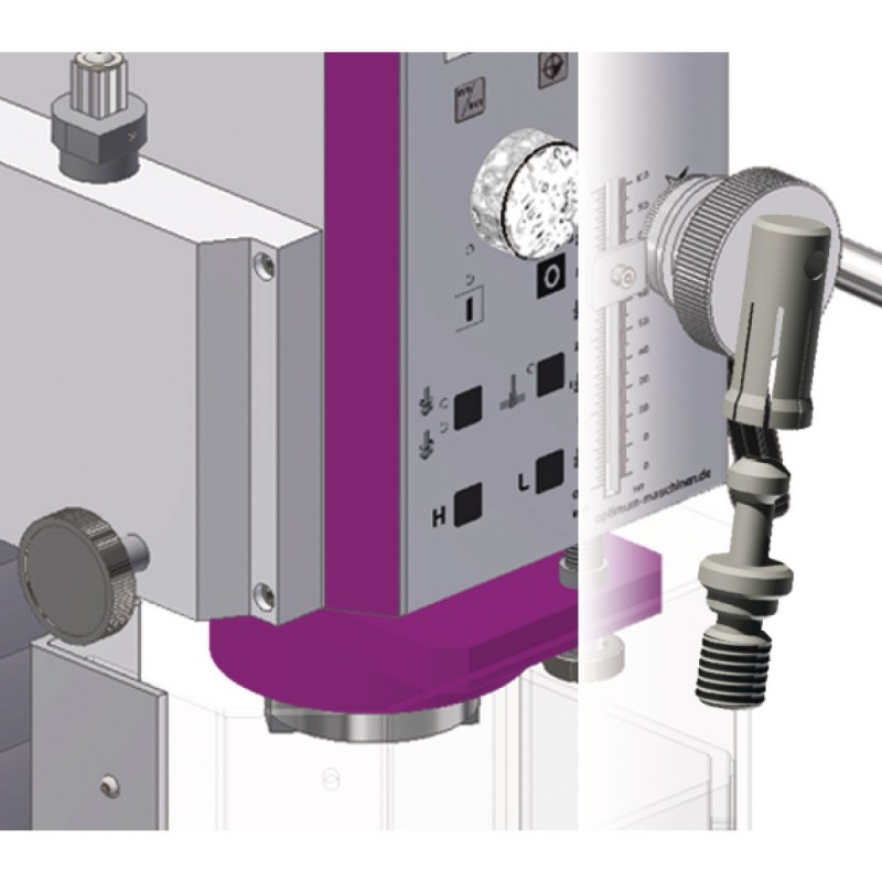 - Przycisk obrotowy w panelu sterującym do ustawiania głębokości wiercenia opcjonalnie w mm lub calach i punktu zerowego