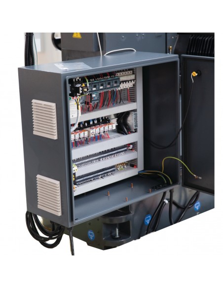 Z cyfrowym 3-osiowym wskaźnikiem położenia DP 700 firmy NEWALL. Z falownikowym napędem osi posuwu sterowanym przez panel sterowania.