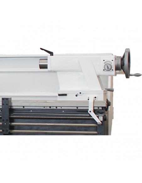 - Szybki posuw - przycisk i dźwignia wyboru Przycisk i dźwignia wyboru do aktywacji szybkiego posuwu w kierunku wzdłużnym i poprzecznym dla jeszcze bardziej wydajnej pracy. Nie wyłącza całej maszyny przy wciąganiu do wyłącznika krańcowego