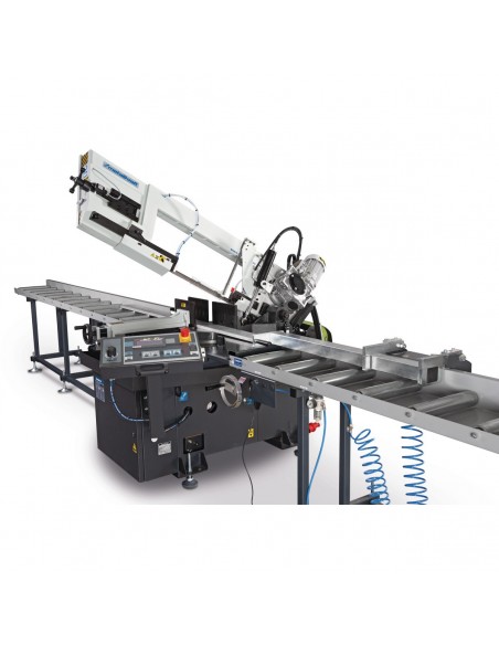 - Stabilny wózek do zatrzymywania materiału, 12 łożysk kulkowych, ruchomy na profilu prowadzącym o dużych wymiarach. Ramię zatrzymujące jest regulowane i zawieszone na zawiasach.
