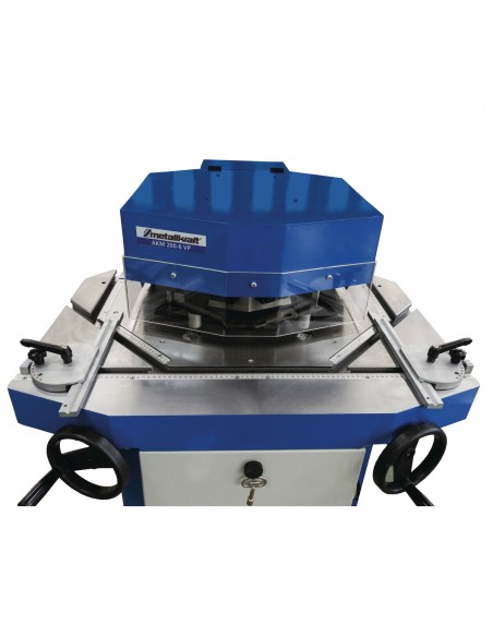 - Solidny stół z wpuszczonymi liniałami i rowkami teowymi do precyzyjnego ustawiania ograniczników obrotu