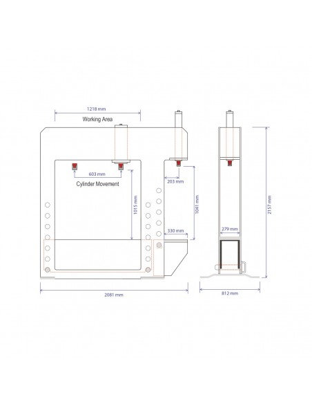 - Hydrauliczne sterowanie skokiem i ruchem cylindra w prawo/w lewo oraz regulacją wysokości stołu