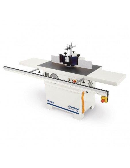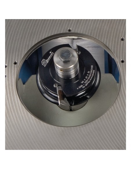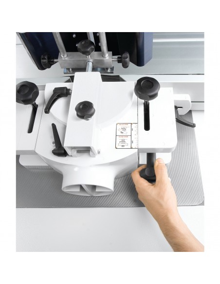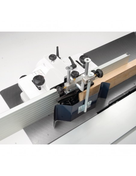 - Osłona frezarki jest standardowo wyposażona w szynę prowadzącą o regulowanej wysokości i płytę ochronną dla maksymalnego bezpieczeństwa.