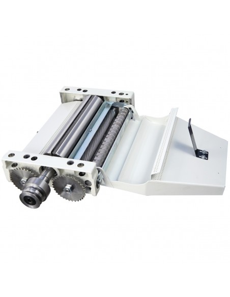 - Uchylony stalowy wałek posuwowy z uzębieniem zapewnia stały i równomierny pobór materiału, dzięki czemu można usuwać wióry już od 0,2 mm (przy min. grubości obrabianego elementu 3 mm) - idealna do ekonomicznego strugania drewna szlachetnego
