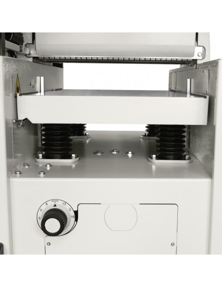 - Regulacja wysokości stołu grubościówki za pomocą koła ręcznego ze zintegrowanym wyświetlaczem wysokości strugania
