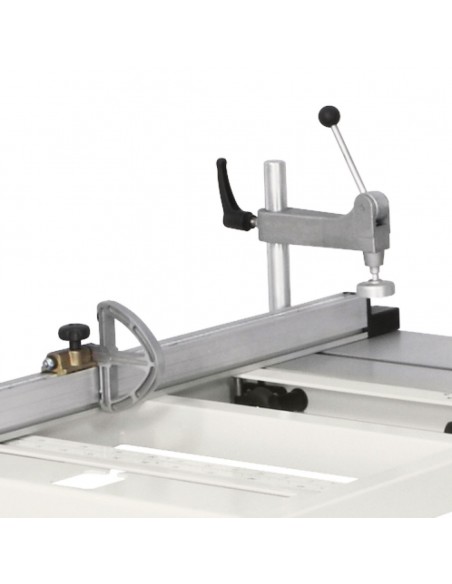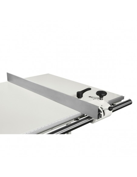 - Płynnie i precyzyjnie pracujący wózek przesuwny formatowy z anodowanego aluminium ze sprawdzonym i stale płynnie pracującym systemem styków kulkowych na hartowanych prowadnicach, 10 lat gwarancji na zużycie prowadnic