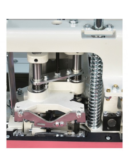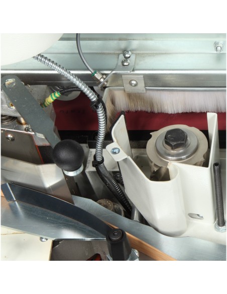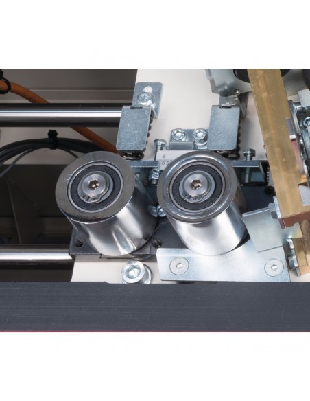 - Precyzyjny posuw detalu za pomocą taśmy podającej u dołu i podwójnych gumowych rolek dociskowych u góry, zapewniających wysoką przyczepność i zapobiegających zadrapaniom na powierzchni detalu