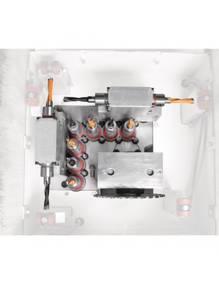 - Jedna głowica wytaczarska z siedmioma pionowymi, czterema poziomymi wrzecionami i jednostką rowkującą li>