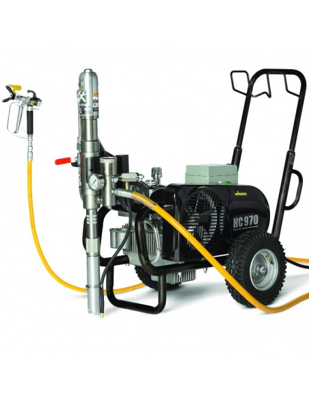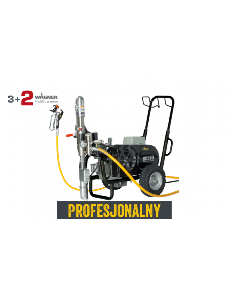 HeavyCoat 970E hydrodynamiczny agregat malarsko - szpachlarski, przeznaczony jest do malowania wszystkimi rodzajami farb (dyspersyjne, lakiery, bejce, farby podkładowe, olejne, emulsje, farby lateksowe, silikonowe, silikatowe, elewacyjne, systemy ciężkiej antykorozji, grunty bitumiczne, materiały bitumiczne jednoskładnikowe).